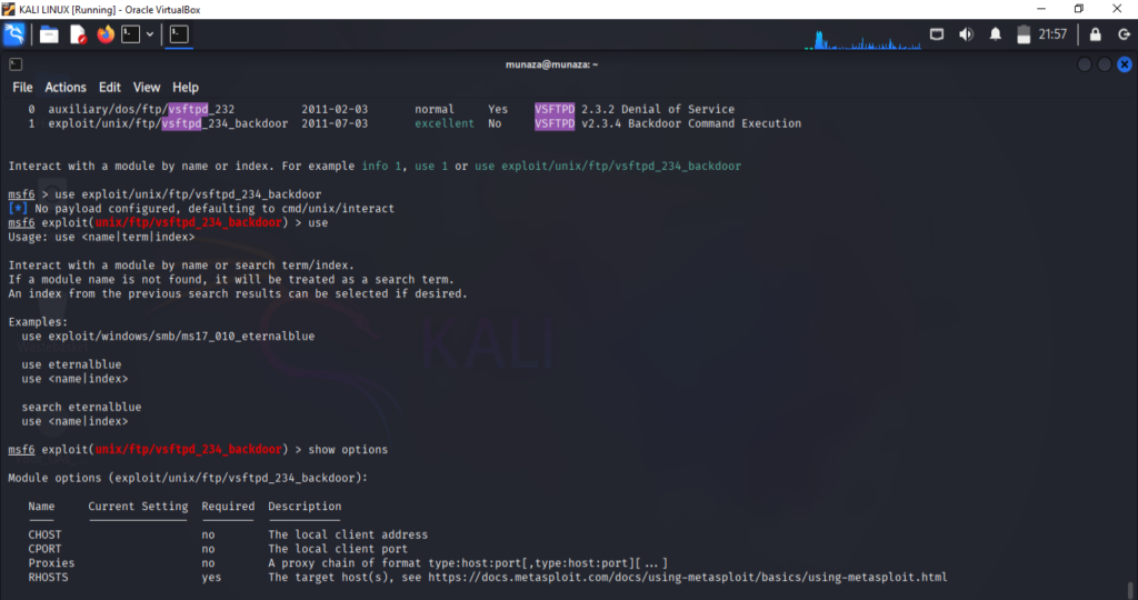 Load Exploit: use exploit/unix/ftp/vsftpd_234_backdoor