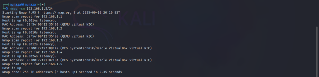 • In Kali Linux, run this command for finding live hosts in metasploitable ***nmap -sn 192.168.1.5/24***