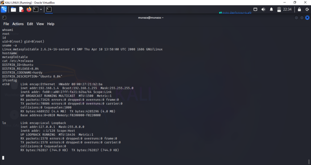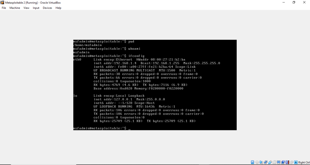 • In Metasploitable2 type in terminal ***ifconfig***