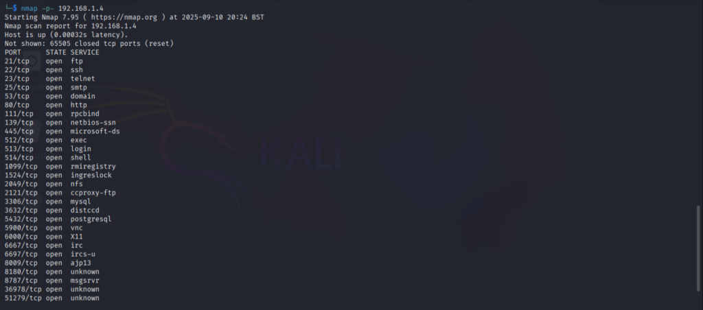 • for port scanning we run command in kali with target IP, the command i run is written below, ***nmap -p- 192.168.1.4***